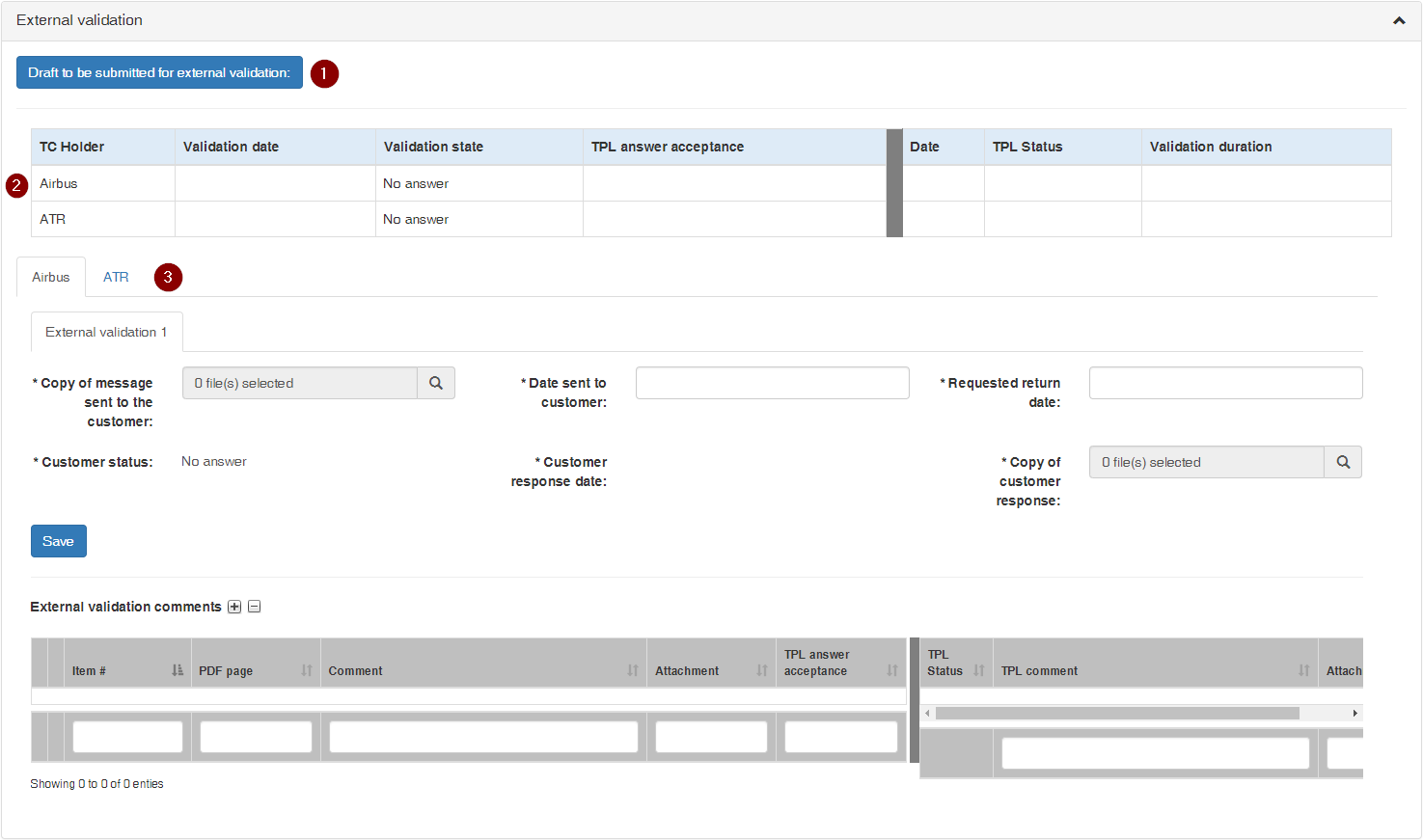 The Techpubs Project Leader first submits the Draft to be validated to each of the listed Customer(s) ; this task is done outside of TPLM, using the specific external process in place with each Customer