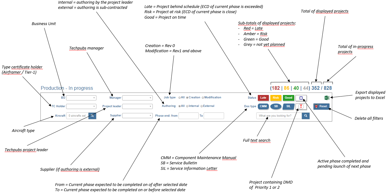 Various filters can be used and combined to define the projects to be displayed and various overall counters allow to assess the number of projects in the selected production board: